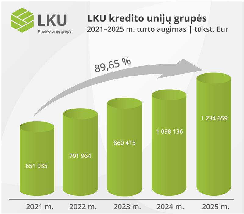44 kredito unijas ir jas prižiūrinčią Lietuvos centrinę kredito uniją vienijančios LKU kredito unijų grupės turtas 2025 m. pabaigoje siekė 1,23 mlrd. eurų, o metinis augimas sudarė 12,4 proc., rodo neaudituoti praėjusių metų finansiniai rezultatai. LKU grupė praėjusiais metais taip pat išlaikė stabilius pelningumo rodiklius bei 17 proc. augino bendrą paskolų portfelį.