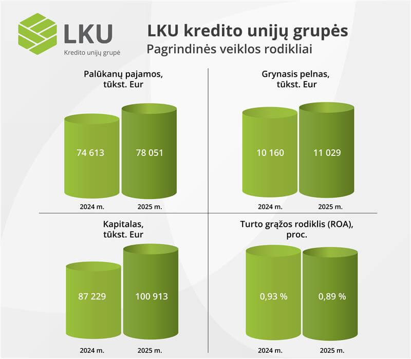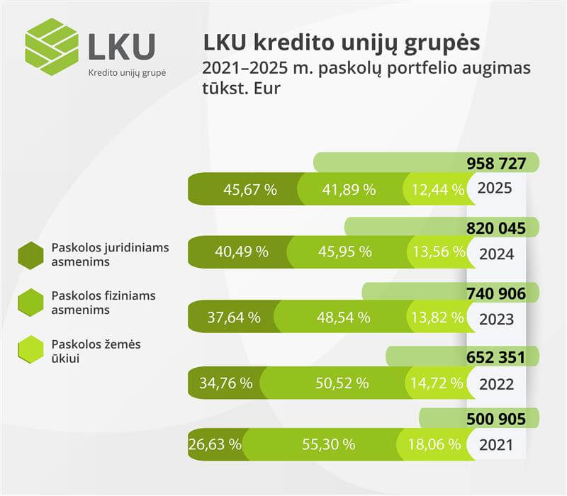Pasibaigus 2025 m., konsoliduotas LKU kredito unijų grupės paskolų portfelis augo 17 proc. ir pasiekė 958,7 mln. eurų. Iš viso per metus buvo sudarytos 4 669 naujos paskolų sutartys, kurių bendra suma siekė 322,7 mln. eurų, arba 35 proc. daugiau nei 2024 m.